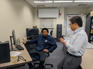 Prof. Bo Chen (right) discussed with DeAndre' (left) about blockchain